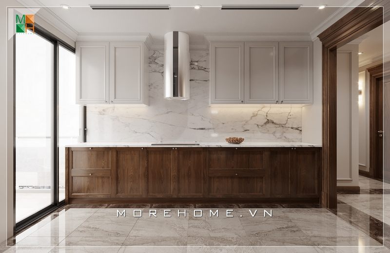 Phòng bếp thiết kế nội thất kiểu tân cổ điển với màu sắc nhẹ nhàng sâu lắng từ hệ thống tủ bếp khiến không gian trở nên thoáng đãng hơn