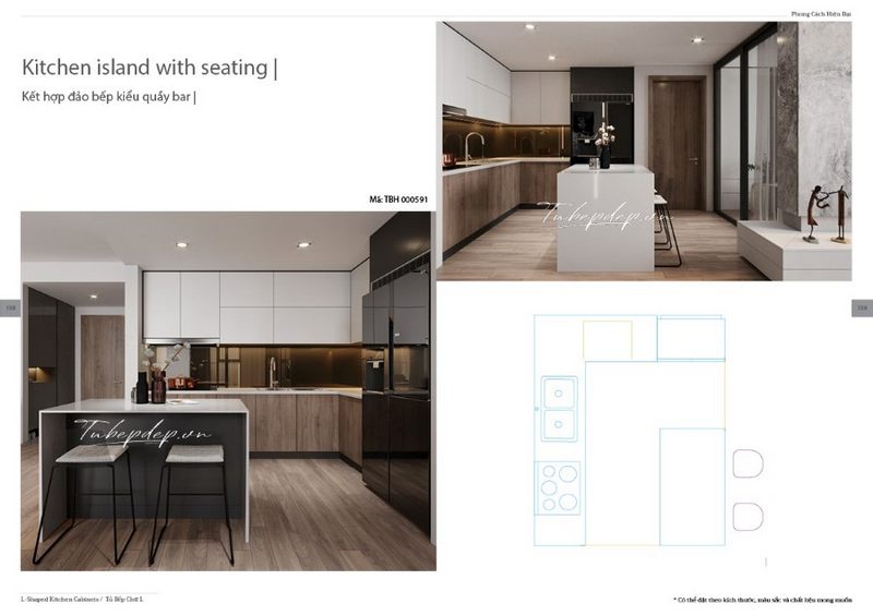 Sẽ là một gợi ý tuyệt vời với sự hiện hữu tủ bếp gỗ óc chó veneer trầm ấm kết hợp gam màu trắng sáng, long lanh từ tủ bếp trên gỗ công nghiệp acrylic và mặt bàn bếp đá nhân tạo LG. Sự tương phản giữa 2 sắc màu sẽ là ý tưởng tuyệt vời cho bố trí nội thất phòng bếp hiện đại cho không gian nhà phố, biệt thự.