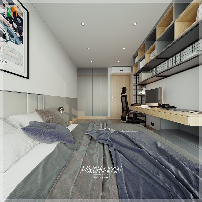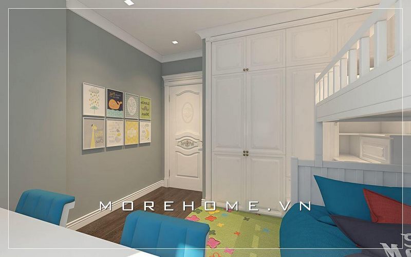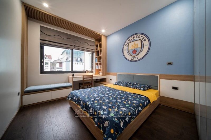 Thiết kế nội thất phòng ngủ bé trai phong cách hiện đại, chát liệu gỗ công nghiệp phù bóng gương tạo độ thoáng hơn cho căn phòng