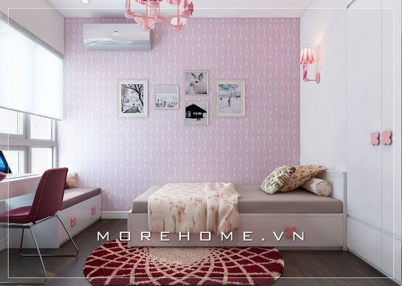 Trang trí nội thất phòng ngủ con ấn tượng với giường ngủ màu trắng sữa, kết hợp đồ nội thất khác tạo nên sự năng động và trẻ trung
