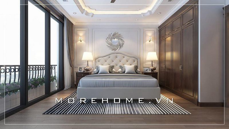 Tủ quần áo gỗ cao cấp với sự kết hợp hài hòa giữa 2 gam màu chủ đạo trắng - nâu trầm mang lại không gian phòng ngủ biệt thự đầy sang trọng và tinh tế