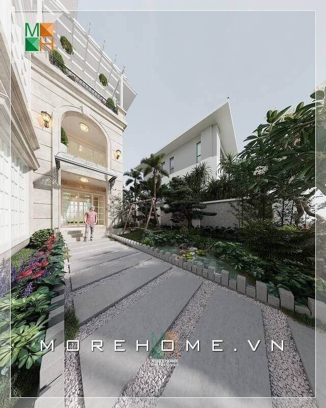 Góc nhìn độc đáo của thiết kế nhà phố thấy rõ vẻ đẹp sang trọng cuốn hút khi có phần sân vườn rộng đầy sức sống.