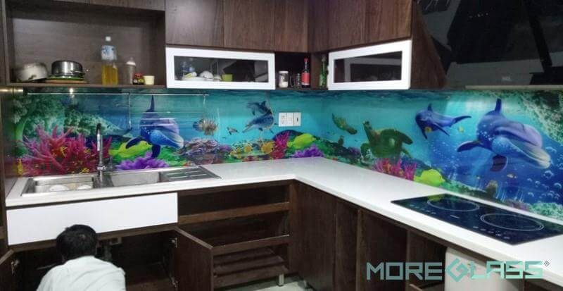 MoreGlass thi công kính ốp bếp 3D họa tiết biển với nhiều sinh vật mang lại sự gần gũi, thoáng mát cho không gian