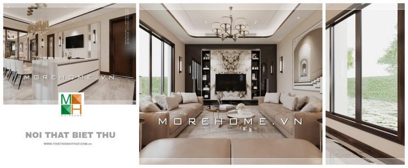 Phòng khách biệt thự tân cổ điển được thiết kế với nội thất gỗ tự nhiên cao cấp, giúp tạo nên một không gian sang trọng.