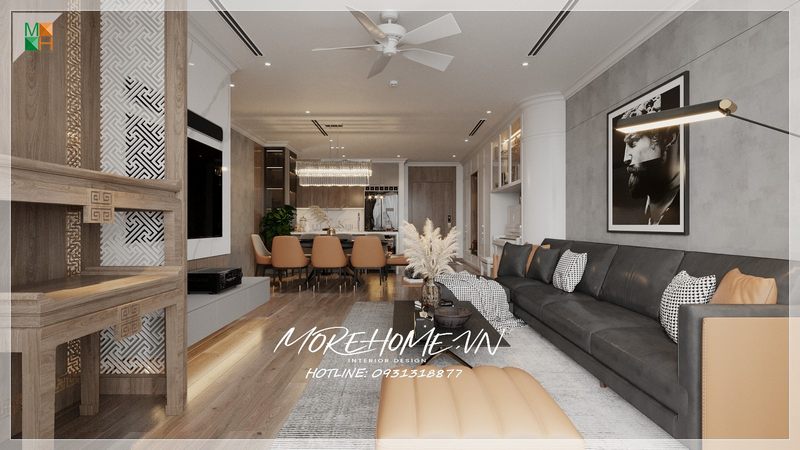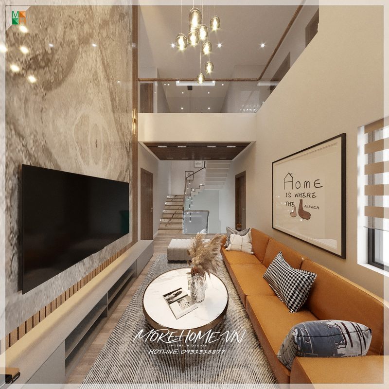 Sofa tân cổ điển với khung gỗ óc chó và vỏ bọc nhung ánh vàng hoàng gia làm nổi bật trong không gian phòng khách căn hộ chung cư thông tầng.