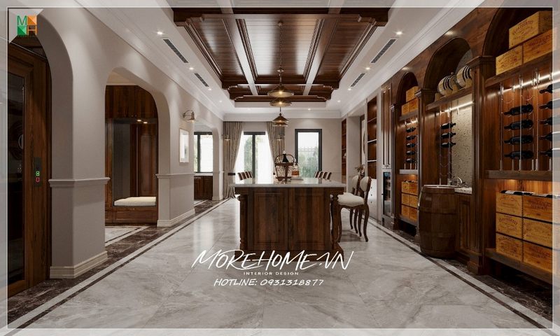 Phòng ăn được thiết kế mở với nội thất gỗ óc chó sang trọng cao cấp, tạo nên một phong cách tân cổ điển cho các biệt thự và nhà phố.